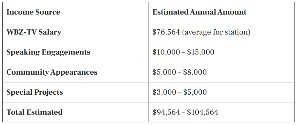 Paula Ebben’s primary income source is her salary as a news anchor and reporter at WBZ-TV, where she has worked for over 25 years. As a veteran broadcaster at a major market television station, Paula commands a competitive salary reflecting her experience, talent, and value to the station. Her compensation includes her base salary for anchoring duties as well as additional income from special reporting assignments and appearances. Beyond her regular broadcasting work, Paula may earn supplemental income through speaking engagements, event moderation, and other media-related activities. Her long tenure and senior position at WBZ-TV ensure she receives comprehensive benefits in addition to her salary, contributing to her overall financial security.